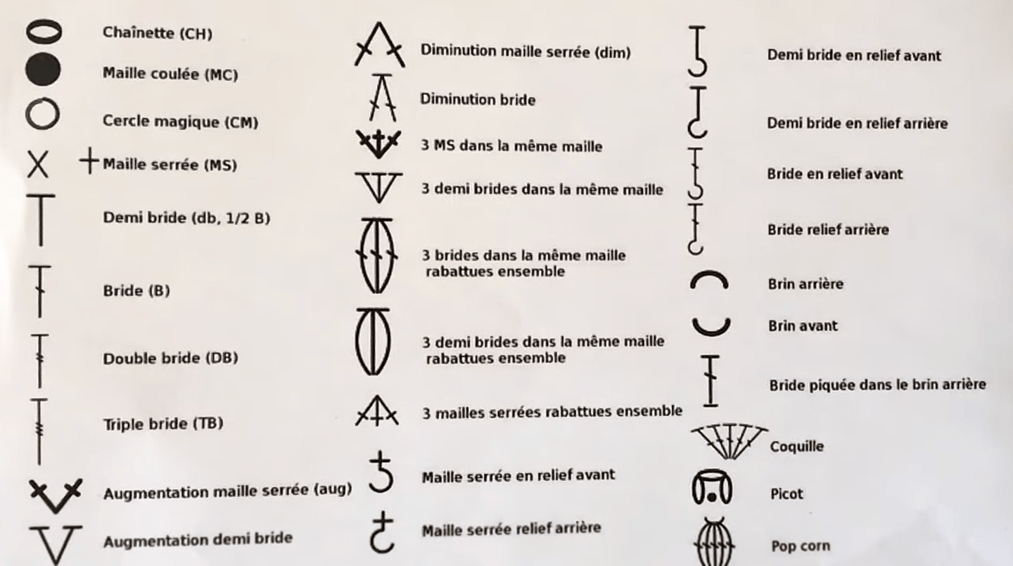 ○ ou • : Maille en l'air (chaîne) : généralement représentée par un petit ovale ou un cercle.