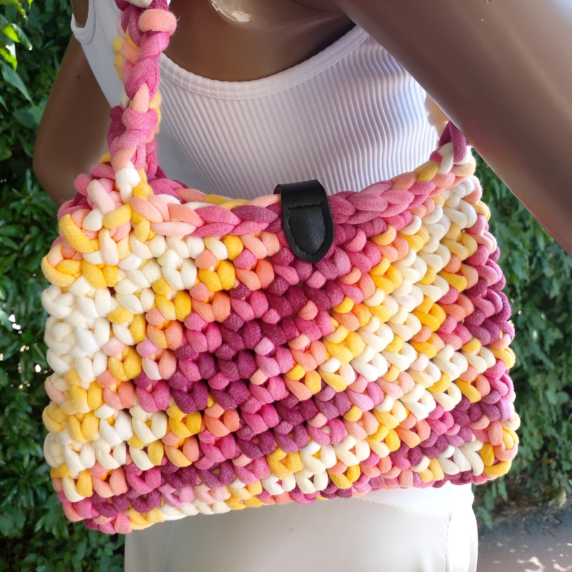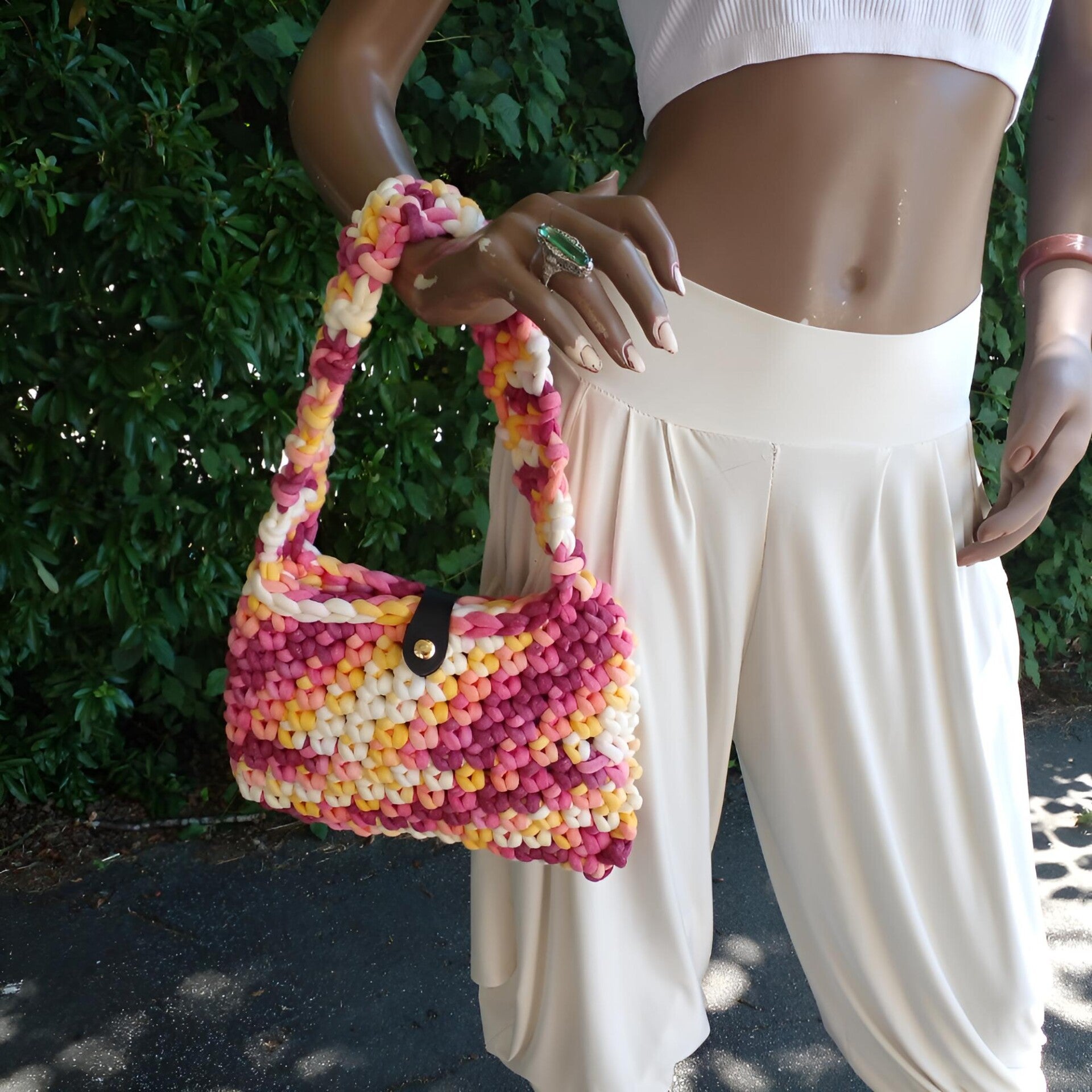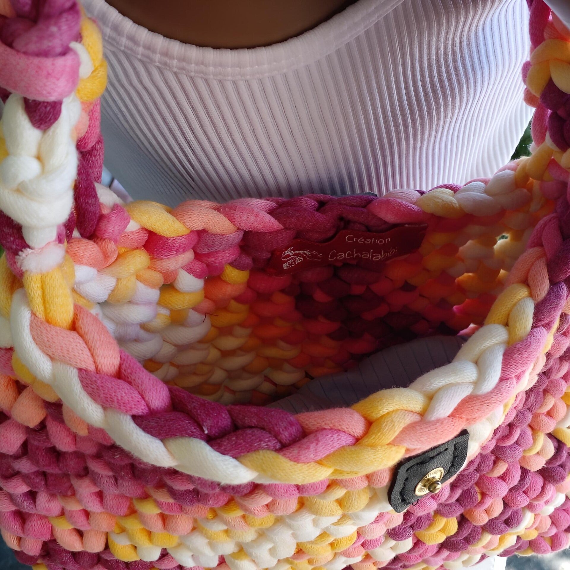 Sac à main Trapilho en crochet fait main et non doubléPièce uniqueComposition : cotonFermeture par une patte pressionLongueur : 26 cmHauteur : 18 cm